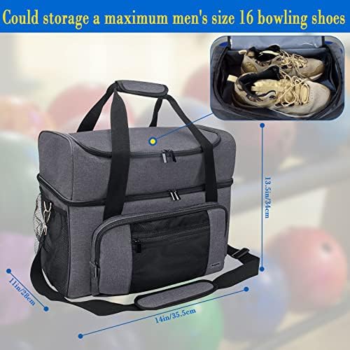 【Extra Large Capacity】: Bowling tote bag is double layer design. The top layer is using PVC inner layer, could contain a maximum men’s size 16 bowling shoes, another layer could contain 2 bowling balls with a stand, another 6 pockets could carry bowling jersey, towels, gloves, and cups. Enough capacity convenient to use.