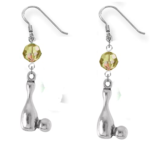 3D Bowling pin and ball silver dangle or drop earrings with a glass crystal (color of crystal may vary from the picture) handmade in the USA by Villages Marketplace. These earrings make a great gift for your bowling friends! Show your support for small local business by purchasing these earrings. New inventory is added on a regular basis. Custom requests are always welcome at Villages Marketplace!