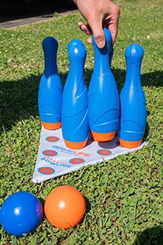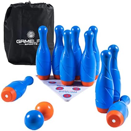 MagnaRack Bowling is made to not blow over from the wind, the pins fall when hit! Magnets on the bottom of each of the 10 bowling pins firmly stand upright on the included MagnaRack metal Bowling Mat to help your little bowler have more of a real bowling game experience. Weather resistant molded Mini Bowling balls are designed to be used from the palm of your hand in grass, sand, carpet or hard surfaces for kids bowling set boys and girls ages 6 and up. Fun for all, indoor or outdoor play!