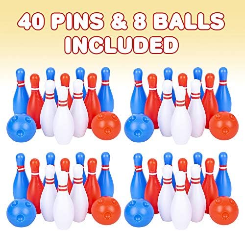 Gamie Bowling Set for Kids, 4 Mini Sets, Each Set Includes 10 Pins and 2 Balls, Durable Plastic Indoor and Outdoor Game, Fun Carnival and Birthday Party Activity for Boys and Girls