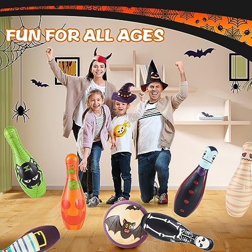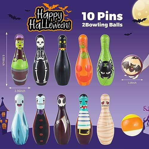 Claasic Design & Easy To Use:Our bowling pins and balls are printed different Halloween characters design including witches, black cats, spiders, pumpkins, etc. You can put these bowling pins in a triangular array, then aim right at the pin and push the bowling ball forward, whoever knocks the most down more pins wins. Perfect Halloween Bowling Game.