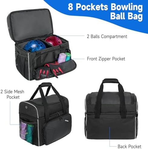 【Multi Pockets】: Besides the top shoes compartment and main caprtment for two bowling balls, the bowling bag specially designed with the transparent zippered pockets for wet towel. And back pocket can hold your phone, keys, wallet and other small itmes, two side pockets can hold the water bottle, folding umbrella and so on, which is very convenient to use.