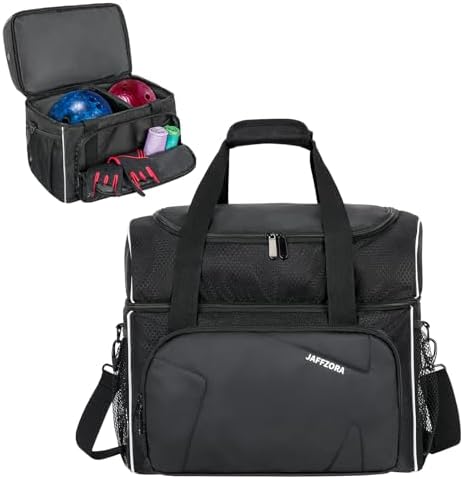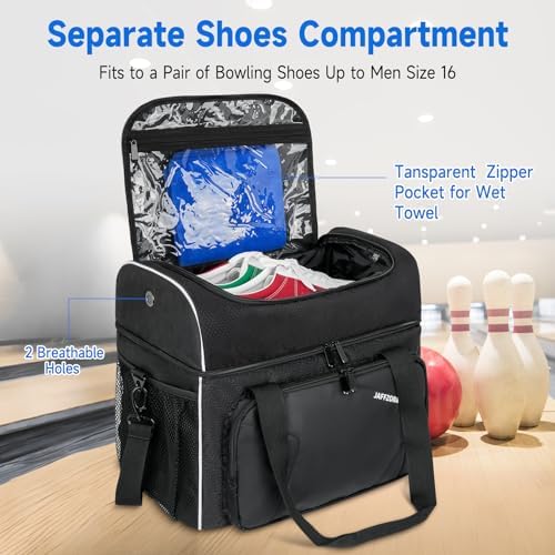 【Separate Shoes Space with Ventilated Holes】: The bowling bag with a top shoes compartment, it can hold one pair of bowling shoes up to size 16 for Men. The shoes compartments also come with 2 breathable holes, keeps air flowing and helps you solve odor problems.