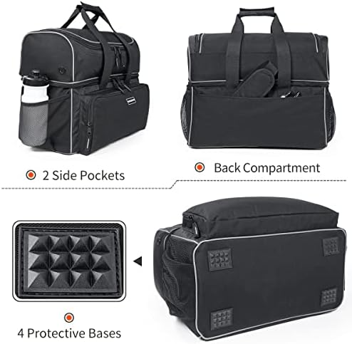 【Padded Double Ball Cup】The main compartment is equipped with a padded inner divider and a thickly padded, foam 2-ball holder to cushion and protect the bowling balls from damage. Besides, there are 4 anti-slip bases on the bottom to provide stability and reduce wear and tear of the 2 ball bowling bag.