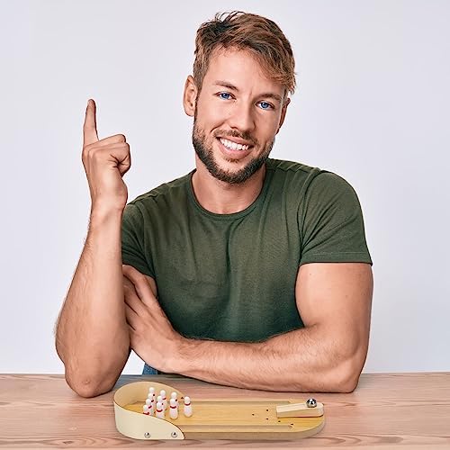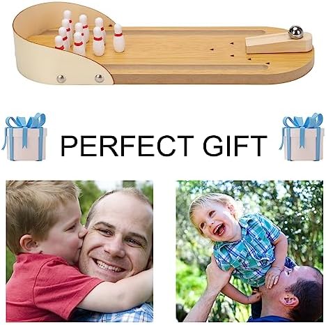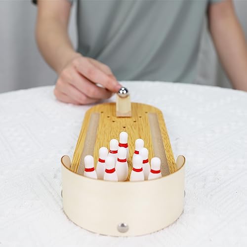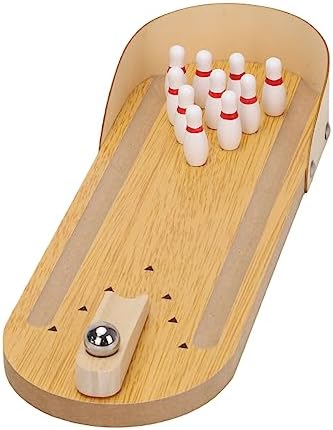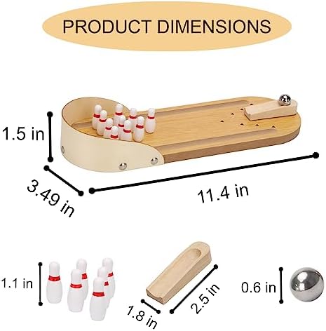 Bowling Set Package — Include:1 x Wooden Base,10 x bowling pins,1 x ramp,1 x stainless steel ball, Bowling lane, launcher and bowling pins are made of sturdy and high quality wood with non-toxic paint finishes.