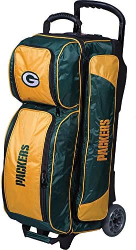 Officially Licensed NFL Three Ball Roller Bowling Bag. Comes with 5″ Smooth Kruze urethane wheels for an ultra smooth and quiet ride. Retractable square locking handle that extends to 44″. Zippered accessory pockets. Officially licensed embroidered NFL logos. Holds up to size 15 shoes.