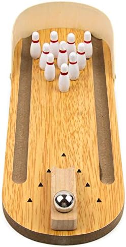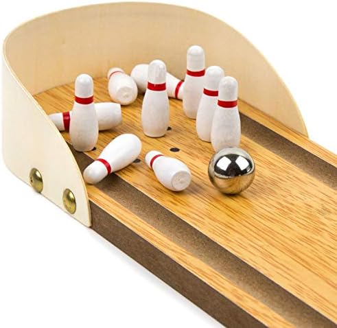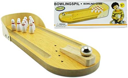 SET INCLUDES: The package includes – 10 x metal bowling pins, 1 x metal bowling ball, 1 x metal bowling ramp with peg, 1 x wooden alley.