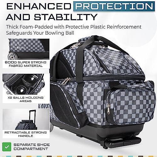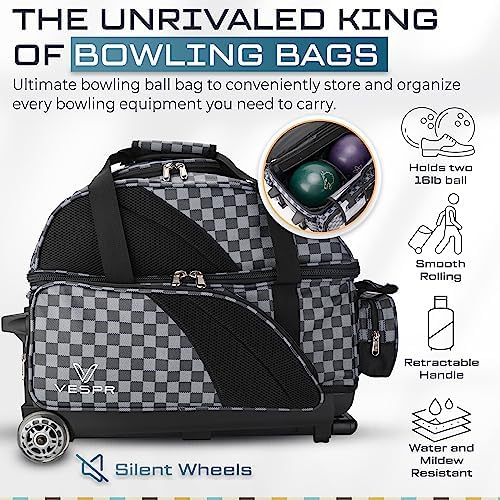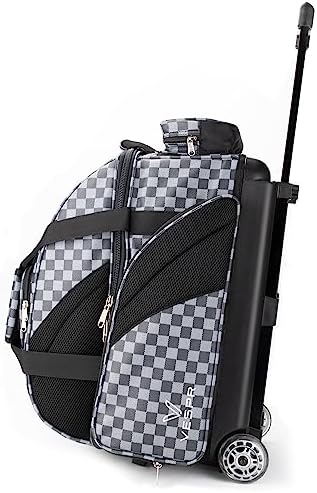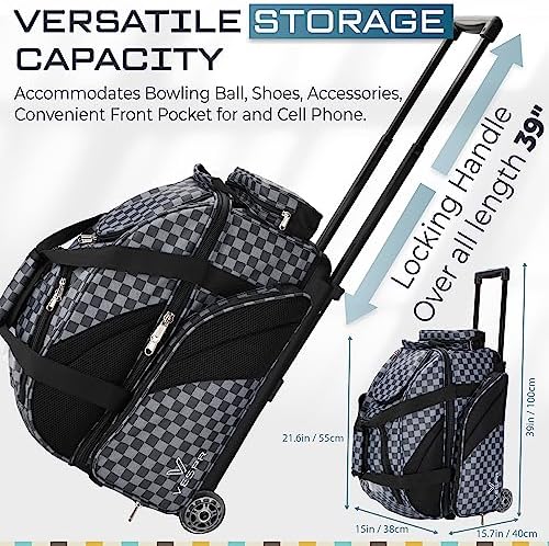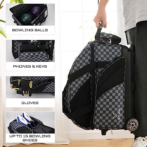 The Deluxe Double Roller by Vespr Rogue easily fits two bowling balls, one pair of bowling shoes (up to US Mens Size 16, US Mens Size 15/14 Wide for SST/Performance Shoes), several accessories, and personal belongings crucial to your game.