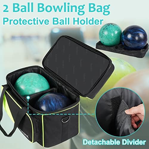 ✔MULTIPLE PROTECTION: The 2 ball bowling bag is equipped with a removable thick padded ball cup holder, the sturdy solid bottom and the four sides’ thick sponges design provide more protection, which can prevent unexpected scratches, shaking or other damage when storing and transporting. The bowling bag made of high-quality water resistant material, keeps the bowling accessories from getting wet in light rain